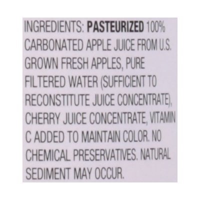INGREDIENTS: Pasteurized 100% Carbonated Apple Juice from U.S. Grown Fresh Apples, Pure Filtered Water (Sufficient to Reconstitute Juice Concentrate), Cherry Juice Concentrate, Vitamin C Added to Maintain Color.