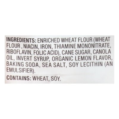 INGREDIENTS: Enriched Wheat Flour (Wheat Flour, Niacin, Iron, Thiamine Mononitrate, Riboflavin, Folic Acid), Cane Sugar, Canola Oil, Invert Syrup, Organic Lemon Flavor, Baking Soda, Sea Salt, Soy Lecithin (an Emulsifier).