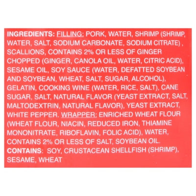 INGREDIENTS: Filling: Pork, Water, Shrimp (Shrimp Water, Salt, Sodium Carbonate, Sodium Citrate), Scallions, Contains 2% or Less of Ginger Chopped (Ginger, Canola Oil, Water, Citric Acid), Sesame Oil, Soy Sauce (Water, Defatted Soybean and Soybean, Wheat, Salt, Sugar, Alcohol), Gelatin, Cooking Wine (Water, Rice, Salt), Cane Sugar, Salt, Natural Flavor (Yeast Extract, Salt, Maltodextrin, Natural Flavor), Yeast Extract, White Pepper, Wrapper: Enriched Wheat Flour (Wheat Flour, Niacin, Reduced Iron, Thiamine Mononitrate, Riboflavin, Folic Acid), Water, Contains 2% or Less of Salt, Soybean Oil.