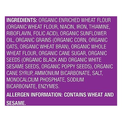 INGREDIENTS: Organic Enriched Wheat Flour (Organic Wheat Flour, Niacin, Iron, Thiamine, Riboflavin, Folic Acid), Organic Sunflower Oil, Organic Grains (Organic Corn, Organic Oats, Organic Wheat Bran), Organic Whole Wheat Flour, Organic Cane Sugar, Organic Seeds (Organic Black and Organic White Sesame Seeds, Organic Poppy Seeds), Organic Cane Syrup, Ammonium Bicarbonate, Salt, Monocalcium Phosphate, Sodium Bicarbonate, Enzymes.