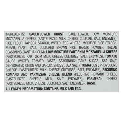 INGREDIENTS: Cauliflower Crust (Cauliflower, Low Moisture Mozzarella Cheese {Pasteurized Milk, Cheese Culture, Salt, Enzymes}, Rice Flour, Tapioca Starch, Water, Egg Whites, Modified Rice Starch, Sugar, Yeast, Salt, Cultured Brown Rice, Garlic Powder, Italian Seasoning, Xanthan Gum), Low Moisture Part Skim Mozzarella Cheese (Pasteurized Part Skim Milk, Cheese Cultures, Salt, Enzymes), Tomato Sauce (Water, Tomato Paste, Seasoning {Cane Sugar, Sea Salt, Dehydrated Onion and Garlic Spices}, Sea Salt), Tomatoes, Provolone Cheese (Pasteurized Milk, Cheese Cultures, Salt, Enzymes), Pecorino Romano and Parmesan Cheese Blend (Pecorino Romano Cheese {Pasteurized Sheep’s Milk, Salt, Enzymes}, Parmesan Cheese {Pasteurized Milk, Cheese Cultures, Salt, Enzymes}), Basil.