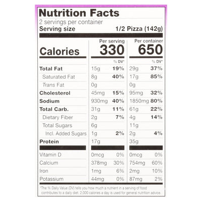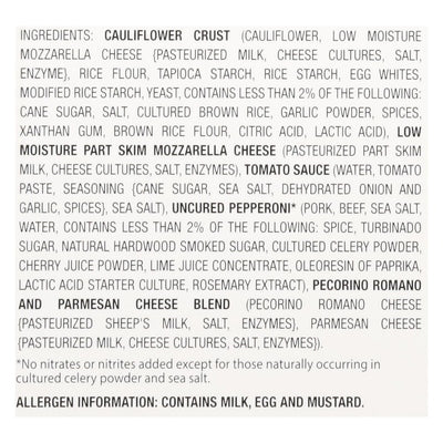 INGREDIENTS: Cauliflower Crust (Cauliflower, Low Moisture Mozzarella Cheese (Pasteurized Milk, Cheese Cultures, Salt, Enzyme), Rice Flour, Tapioca Starch, Rice Starch, Egg Whites, Modified Rice Starch, Yeast, Contains Less than 2% of the Following: Cane Sugar, Salt, Cultured Brown Rice, Garlic Powder, Spices, Xanthan Gum, Brown Rice Flour, Citric Acid, Lactic Acid), Low Moisture Part Skim Mozzarella Cheese (Pasteurized Part Skim Milk, Cheese Cultures, Salt, Enzymes), Tomato Sauce (Water, Tomato Paste, Seasoning (Cane Sugar, Sea Salt, Dehydrated Onion and Garlic, Spices), Sea Salt), Uncured Pepperoni (No Nitrates or Nitrites Added Except for Those Naturally Occurring in Cultured Celery Powder and Sea Salt)(Pork, Beef, Sea Salt, Water, Contains Less than 2% of the Following: Spice, Turbinado Sugar, Natural Hardwood Smoked Sugar, Cultured Celery Powder, Cherry Juice Powder, Lime Juice Concentrate, Oleoresin of Paprika, Lactic Acid Starter Culture, Rosemary Extract), Pecorino Romano and Parmesan Cheese Blend (Pecorino Romano Cheese (Pasteurized Sheep's Milk, Salt, Enzymes), Parmesan Cheese (Pasteurized Milk, Cheese Cultures, Salt, Enzymes)).