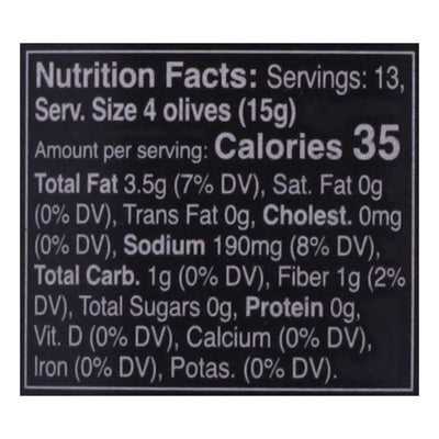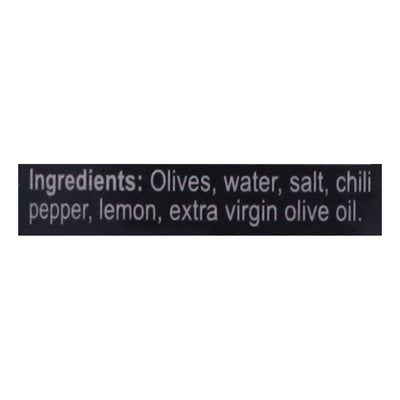 INGREDIENTS: Olives, Water, Salt, Chili Pepper, Lemon, Extra Virgin Olive Oil.
