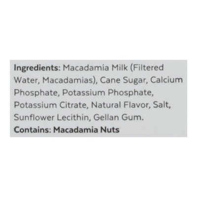 INGREDIENTS: Macadamia Milk (Filtered Water, Macadamias), Cane Sugar, Calcium Phosphate, Natural Flavor, Salt, Xanthan Gum, Yam Flour, Sunflower Lecithin, Potassium Citrate, Dipotassium Phosphate.