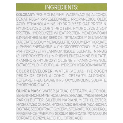 DESCRIPTION: This Kit Contains: 1. Naturtint. Colorant (2.03 fl.oz./60 ml); 2. Color Developer (2.03 fl.oz./60 ml); 3. Quinoa Mask (1.69 fl.oz. / 50 ml); 4.. Protective Gloves; 5. Instruction Leaflet. Suitable for Vegans. Gluten free. Colors inspired by nature. New! Quinoa mask. Long-lasting gray coverage. Radiant color & shine. Silky & hydrated hair. Clean beauty, science in harmony. Olive Oleic Acid: Provides vitality and moisturization, for smoother, nourished hair. Meadowfoam Seed Oil: Nourishes and conditions the hair for extended shine and color. Quinoa Mask: Quinoa (Grown and harvested using sustainable practices). A "complete protein" with all essential amino acids that helps to fix the hair color, resulting in longer-lasting and more intense shades. Organic Shea Butter (Grown and harvested using sustainable practices): Deeply moisturizing and nourishing, thanks to its high concentration of vitamins and fatty acids. Baobab Proteins (Grown and harvested using sustainable practices): Nourishes the hair from root to tips, providing vitality, shine and volume. Healthier, younger looking hair. Results based on your color. Final color result will depend on the color, thickness and overall condition of your hair so a color strand test, prior to full application, is recommended. You can go as dark as you wish with Naturtint. When lightening your hair, you can only lighten up to 2 shade numbers. Dermatologically tested. Expert color & care. QS International quality system. Swiss Certified Privat Label. GMP Certified by QS International. www.fsc.org. www.naturtintusa.com. www.phergal.com. For additional tips on color selection and application techniques, Please contact the Naturtint USA helpline at: 518-434-0340; www.naturtintusa.com. Email: info@naturtintusa.com. USDA Certified Biobased Product: Product 100%. Naturally responsible. FSC: Mix - Packaging from responsible sources. www.fsc.org. Forests for all forever. Against animal testing. Distributed in the USA. Made in Spain. < Colorant: PEG-2 Oleamine, Water (Aqua), Alcohol Denat. PEG-4 Rapeseedamide, Propanediol, Oleic Acid, Ethanolamine, Hydrolyzed Oat Protein, Hydrolyzed Corn Protein, Hydrolyzed Soy Protein, Hydrolyzed Wheat Protein, Meadowfoam (Limnanthes Alba) Seed Oil, Tetrasodium Glutamate Diacetate Sodium Metabisulfite, Sodium Erythorbate, P-Phenylenediamine, 4-Chlororesorcinol, 2-Amino -4-Hydroxyethylaminoanisole Sulfate, N,N-Bis (2-Hydroxyethyl)-P-Phenylenediamine Sulfate, 4-Amino-2-Hydroxytoluene, M-Aminophenol, Octadecyl Di-T-Butyl-4-Hydroxyhydrocinnamate. Color Developer: Water (Aqua), Hydrogen Peroxide, Cetyl Alcohol, Cetearyl Alcohol, Ceteareth-20, Laureth-3, Oxyquinoline Sulfate, Phosphoric Acid. Quinoa Mask: Water (Aqua), Cetearyl Alcohol, Behentrimonium Methosulfate Shea (Butyrospermum Parkii) Butter, Silybum Marianum Ethyl Ester, Hydrolyzed Quinoa, Hydrolyzed Baobab (Adansonia Digitata) Seed Extract, Glyceryl Stearate Tocopherol Fragrance (Parfum), Sodium Benzoate, Potassium Sorbate, Benzyl Alcohol, Citric Acid.