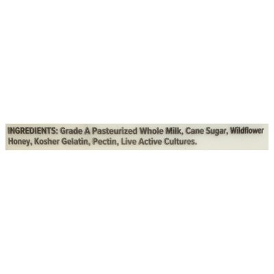 INGREDIENTS: Grade A Pasteurized Whole Milk, Cane Sugar, Wildflower Honey, Kosher Gelatin, Pectin, Live Active Cultures. Live Active Cultures: S. Thermophilus, L. Bulgaricus, L. Acidophilus, Bifidus, L. Casei.