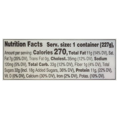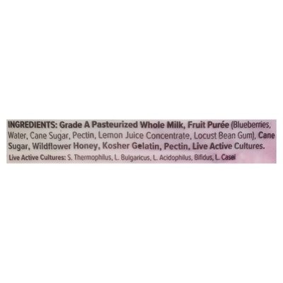 INGREDIENTS: Grade A Pasteurized Milk, Fruit Puree (Blueberries, Cane Sugar, Water, Pectin, Locust Bean Gum), Cane Sugar, Honey, Kosher Gelatin, Pectin, Live Active Cultures (S. Thermophilus, L. Bulgaricus, L. Acidophilus, Bifidus, and L. Casei).