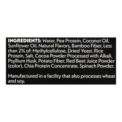 INGREDIENTS: Water, Pea Protein, Coconut Oil, Sunflower Oil, Natural Flavors, Bamboo Fiber, Less than 2% of: Methylcellulose, Dried Yeast, Rice Protein, Salt, Cocoa Powder Processed with Alkali, Psyllium Husk, Potato Fiber, Red Beet Juice Powder (Color), Chia Protein Concentrate, Spinach Powder.