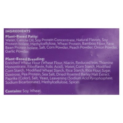 INGREDIENTS: Plant- Based Patty: Water, Canola Oil, Textured Soy Protein, Natural Flavors, Soy Protein Isolate, Methylcellulose, Wheat Protein, Bamboo Fiber, Fava Bean Protein Isolate, Salt, Corn Powder, Peach Powder, Plant-Based Breading: Enriched Wheat Flour (Wheat Flour, Niacin, Reduced Iron, Thiamine Mononitrate, Riboflavin, Folic Acid), Water, Modified Corn Starch, Corn Starch, Modified Wheat Starch, Sugar, Rice Starch, Rice Flour, Dextrose, Salt, Methylcellulose, Pea Protein, Leavening (Sodium Acid Pyrophosphate, Sodium Bicarbonate), Paprika (Color), Yeast, Dried Roasted Barley Malt Extract, Spice Extractives.
