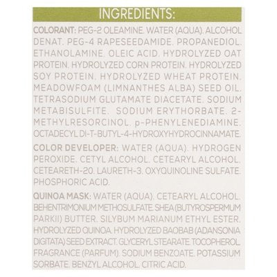 DESCRIPTION: This Kit Contains: 1. Naturtint Colorant 2.03 fl.oz. / 60 ml e. 2. Color Developer 2.03 fl.oz. / 60 ml e. 3. Quinoa Mask 1.69 fl.oz. / 50 ml e. 4. Protective Gloves. 5. Instruction Leaflet. Suitable for vegans. Gluten free. Colors inspired by nature. Ammonia free. Long-lasting gray coverage. Quinoa mask. New! Radiant color & shine. Silky & hydrated hair. Clean beauty, science in harmony. Intense long-lasting permanent hair color innovative and gentle formula inspired by nature. Olive Oleic Acid: Provides vitality and moisturization, for smoother, nourished hair. Meadowfoam Seed Oil: Nourishes and conditions the hair for extended shine and color. Quinoa Mask: Quinoa (Grown and harvested using sustainable practices): A complete protein with all essential amino acids that helps to fix the hair color, resulting in longer-lasting and more intense shades. Organic Shea Butter (Grown and harvested using sustainable practices): Deeply moisturizing and nourishing, thanks to its high concentration of vitamins and fatty acids. Baobab Proteins (Grown and harvested using sustainable practices): Nourishes the hair from root to tips, providing vitality, shine and volume. Healthier, younger looking hair. Final color result will depend on the color. Thickness and overall condition of your hair so a color strand test, prior to full application, is recommended. You can go as dark as you wish with Naturint when lightening your hair, you can only lighten up to 2 shade numbers. Dermatologically tested. Expert color & care. Laboratorios Phergal - Inspiring beauty. QS International quality system. Swiss Certified Privat Label. ISO 22716. GMP Certified by QS International. www.naturtintusa.com. www.phergal.com. For additional tips on color selection and application techniques, please contact the Naturtint USA helpline at 518-434-0340. www.naturtintusa.com. Email: info(at)naturtintusa.com. USDA Certified Biobased Product: Product 79%. Naturally responsible. Respecting our forests. Against animal testing. Made in Spain. < Colorant: PEG-2 Oleamine, Water (Aqua), Alcohol Denat. PEG-4 Rapeseedamide, Propanediol, Ethanolamine, Oleic Acid, Hydrolyzed Oat Protein, Hydrolyzed Corn Protein, Hydrolyzed Soy Protein, Hydrolyzed Wheat Protein, Meadowfoam (Limnanthes Alba) Seed Oil, Tetrasodium Glutamate Diacetate, Sodium Metabisulfite, Sodium Erythorbate, 2- Methylresorcinol, P-Phenylenediamine, Octadecyl Di-T-Butyl-4-Hydroxyhydrocinnamate. Color Developer: Water (Aqua), Hydrogen Peroxide, Cetyl Alcohol, Cetearyl Alcohol, Ceteareth-20, Laureth-3, Oxyquinoline Sulfate, Phosphoric Acid. Quinoa Mask: Water (Aqua), Cetearyl Alcohol, Behentrimonium Methosulfate Shea (Butyrospermum Parkii) Butter, Silybum Marianum Ethyl Ester, Hydrolyzed Quinoa, Hydrolyzed Baobab (Adansonia Digitata) Seed Extract, Glyceryl Stearate, Tocopherol, Fragrance (Parfum), Sodium Benzoate, Potassium Sorbate, Benzyl Alcohol, Citric Acid.