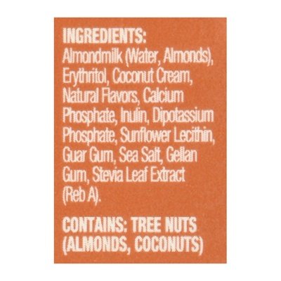 INGREDIENTS: Almondmilk (Water, Almonds), Erythritol, Coconut Cream, Natural Flavors, Calcium Phosphate, Inulin, Dipotassium Phosphate, Sunflower Lecithin, Guar Gum, Sea Salt, Gellan Gum, Stevia Leaf Extract (Reb A).