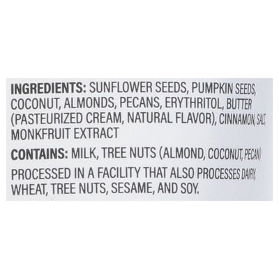 INGREDIENTS: Sunflower Seeds, Pumpkin Seeds, Coconut, Almonds, Pecans, Erythritol, Butter (Pasteurized Cream, Natural Flavor), Cinnamon, Salt, Monk Fruit Extract.