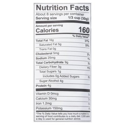 PRODUCT DETAILS: 2 g (see back panel for more information) net carbs (per serving). 1 g sugar (per serving). (How to calculate net carbs per serving: TC: total carbs (9 g) - DF: dietary fiber (3 g) - SA: sugar alcohol (4 g) - NC: net carbs (see back panel for more information) (2 g). Certified gluten free. gfco.org. This product is Keto Certified. ketocertified.com. No sugar added (not a low calorie food. See nutrition panel for information on sugar and calorie content). Grain free. Non GMO. New look! Better taste! At Nu Trail, we meticulously craft the best high-quality, low-sugar experiences. Enjoy the sweet crunch of our nut granolas with more than just milk and yogurt - elevate everything from your smoothies and baked goods to your ice cream. Calling it granola doesn't quite do NuTrail justice, but if you're here, you either get it - or you're about to. www.nutrail.com. For great recipes, visit us at www.nutrail.com & on social Instagram, Facebook, TikTok.