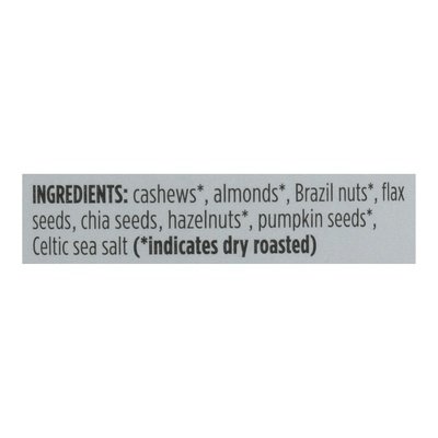 INGREDIENTS: Cashews (Indicates Dry Roasted), Almonds (Indicates Dry Roasted), Brazil Nuts (Indicates Dry Roasted), Flax Seeds, Chia Seeds, Hazelnuts (Indicates Dry Roasted), Pumpkin Seeds (Indicates Dry Roasted), Celtic Sea Salt.