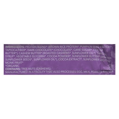 INGREDIENTS: Protein Blend (Organic) (Brown Rice Protein (Organic), Pumpkin Seed Protein (Organic)), Tapioca Fiber (Organic), Dark Chocolate (Organic) (Chocolate (Organic), Cane Sugar (Organic), Cocoa Butter (Organic)), Cashew Butter (Organic)(Roasted Cashews (Organic), Sunflower Oil (Organic)), Tapioca Syrup (Organic), Vegetable Glycerin (Organic), Cocoa Powder (Organic), Sunflower Butter (Organic)(Roasted Sunflower Seeds (Organic), Sunflower Oil (Organic)), Cocoa Extract (Organic), Sunflower Lecithin (Organic), Monk Fruit (Organic).