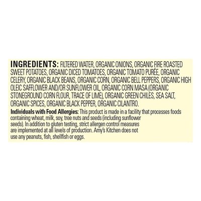 DESCRIPTION: Tortilla with fire roasted sweet potatoes. Certified Organic: Quality Assurance International. Certified vegan. Vegan.org. USDA Organic. Gluten free. No GMOs - No genetically engineered ingredients. Plant based. Ready to serve. Inspired by Mexican flavors, our chef came up with Amy's take on this classic soup. Organic sun-ripened tomatoes, corn masa, bell peppers, black beans and fire roasted sweet potatoes combined with organic spices make our Organic Tortilla Soup distinctive and delicious. Amy's Kitchen was started when our daughter Amy was born in 1987. We are a family business deeply committed to producing convenient organic foods made with the highest quality ingredients. amys.com. how2recycle.info. We love to hear from you. amys.com. Non-BPA lining. < Filtered Water, Organic Onions, Organic Fire Roasted Sweet Potatoes, Organic Diced Tomatoes, Organic Tomato Puree, Organic Celery, Organic Black Beans, Organic Corn, Organic Bell Peppers, Organic High Oleic Safflower and/or Sunflower Oil, Organic Corn Masa (Organic Stoneground Corn Flour, Trace of Lime), Organic Green Chiles, Sea Salt, Organic Spices, Organic Black Pepper, Organic Cilantro.