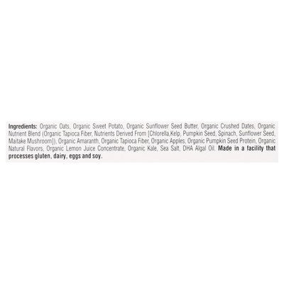 INGREDIENTS: Organic Oats, Organic Sweet Potato, Organic Sunflower Seed Butter, Organic Crushed Dates, Organic Nutrient Blend (Organic Tapioca Fiber, Nutrients Derived from [Chlorella, Kelp, Pumpkin Seed, Spinach, Sunflower Seed, Maitake Mushroom]), Organic Amaranth, Organic Tapioca Fiber, Organic Apples, Organic Pumpkin Seed Protein, Organic Natural Flavors, Organic Lemon Juice Concentrate, Organic Kale, Sea Salt, DHA Algal Oil.