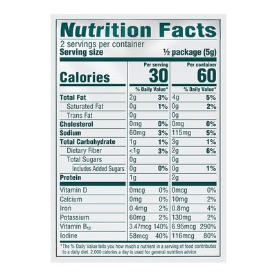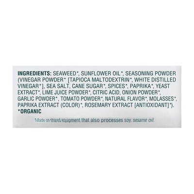 INGREDIENTS: Seaweed (Organic), Sunflower Oil (Organic), Seasoning Powder (Vinegar Powder (Organic) [Tapioca Maltodextrin (Organic), White Distilled Vinegar (Organic)], Sea Salt, Cane Sugar (Organic), Spices (Organic), Paprika (Organic), Yeast Extract (Organic), Lime Juice Powder (Organic), Citric Acid, Onion Powder (Organic), Garlic Powder (Organic), Tomato Powder (Organic), Natural Flavor (Organic), Molasses (Organic), Paprika Extract (Color) (Organic), Rosemary Extract [Antioxidant] (Organic)).