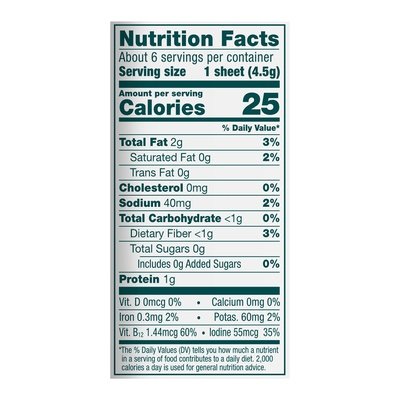 PRODUCT DETAILS: greater than 1 g net carbs. USDA Organic. Certified gluten free. Certified vegan. Vegan.org. Certified Organic: Quality Assurance International (QAI). Non-GMO Project verified. nongmoproject.org. Roasted to light crispy perfection. Delicious, nutritious, snackable fun! Powered by one of the world's most nutrient-dense veggies, our seaweed sheets are craveably crafted to deliver an amazing crispy crunch with a salty umami flavor that will have you saying gimMe more! No 1 organic seaweed. Did you know? Gim means seaweed in Korea. More of a good thing. What if we made our famous roasted seaweed snacks larger? Like, way larger, so you could have more of that crispy crunch and salty umami taste you love. Done! And with less than 1g net carbs, this might just be a delicious + nutritious new way to snack, wrap, crumble, or roll! Snack, sprinkle, or wrap! gimmesnacks.com. Instagram. Facebook (at)gimmegrams. Scan code to discover delicious recipes! Try more of our tasty snacks at gimmesnacks.com. Sea Turtle Conservancy. Product of Korea.
