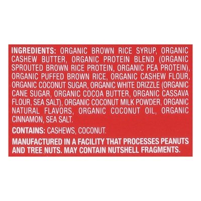 INGREDIENTS: Organic Brown Rice Syrup, Organic Cashew Butter, Organic Protein Blend (Organic Sprouted Brown Rice Protein, Organic Pea Protein), Organic Puffed Brown Rice, Organic Cashew Flour, Organic Coconut Sugar, Organic White Drizzle (Organic Cane Sugar, Organic Cocoa Butter, Organic Cassava Flour, Sea Salt), Organic Coconut Milk Powder, Organic Natural Flavors, Organic Coconut Oil, Organic Cinnamon, Sea Salt.