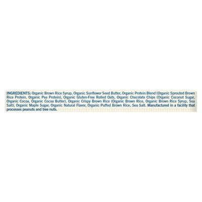INGREDIENTS: Organic Brown Rice Syrup, Organic Sunflower Seed Butter, Organic Protein Blend (Organic Sprouted Brown Rice Protein, Organic Pea Protein), Organic Gluten-Free Rolled Oats, Organic Chocolate Chips (Organic Coconut Sugar, Organic Cocoa, Organic Cocoa Butter), Organic Crispy Brown Rice (Organic Brown Rice, Organic Brown Rice Syrup, Sea Salt), Organic Maple Sugar, Organic Natural Flavor, Organic Puffed Brown Rice, Sea Salt.