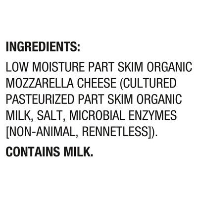 INGREDIENTS: Low Moisture Part Skim Organic Mozzarella Cheese (Cultured Pasteurized Part Skim Organic Milk, Salt, Microbial Enzymes [Non-Animal, Rennetless]).
