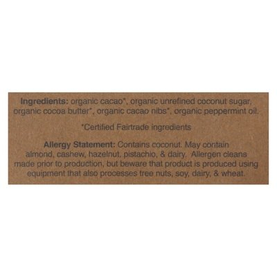 INGREDIENTS: Organic Cacao (Certified Fairtrade Ingredients), Organic Unrefined Coconut Sugar, Organic Cocoa Butter (Certified Fairtrade Ingredients), Organic Cacao Nibs (Certified Fairtrade Ingredients), Organic Peppermint Oil.