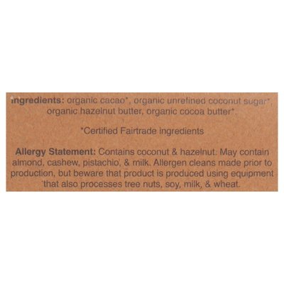 INGREDIENTS: Organic Cacao (Certified Fairtrade Ingredients), Organic Unrefined Coconut Sugar (Certified Fairtrade Ingredients), Organic Hazelnut Butter, Organic Cocoa Butter (Certified Fairtrade Ingredients).