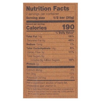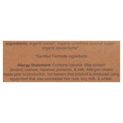 INGREDIENTS: Organic Cacao (Certified Fairtrade Ingredients), Organic Unrefined Coconut Sugar (Certified Fairtrade Ingredients), Organic Cocoa Butter (Certified Fairtrade Ingredients).