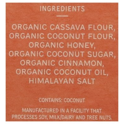 INGREDIENTS: Organic Cassava Flour, Organic Coconut Flour, Organic Honey, Organic Coconut Sugar, Organic Cinnamon, Organic Coconut Oil, Himalayan Salt.