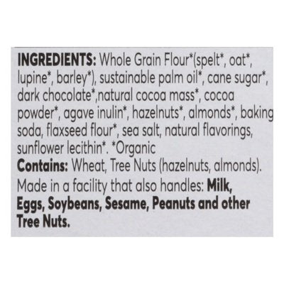 INGREDIENTS: Whole Grain Flour (Organic) (Spelt (Organic), Oat (Organic), Lupine (Organic), Barley (Organic)), Sustainable Palm Oil (Organic), Cane Sugar (Organic), Dark Chocolate (Organic), Natural Cocoa Mass (Organic), Cocoa Powder (Organic), Agave Inulin (Organic), Hazelnuts (Organic), Almonds (Organic), Baking Soda, Flaxseed Flour (Organic), Sea Salt, Natural Flavorings, Sunflower Lecithin (Organic).