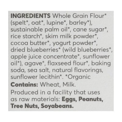 INGREDIENTS: Whole Grain Flour (Organic) (Spelt (Organic), Oat (Organic), Lupine (Organic), Barley (Organic)), Sustainable Palm Oil (Organic), Cane Sugar (Organic), Rice Starch (Organic), Skim Milk Powder (Organic), Cocoa Butter (Organic), Yogurt Powder (Organic), Dried Blueberries (Organic) (Wild Blueberries (Organic), Apple Juice Concentrate (Organic), Sunflower Oil (Organic)), Agave (Organic), Flaxseed Flour (Organic), Baking Soda, Sea Salt, Natural Flavorings, Sunflower Lecithin (Organic).