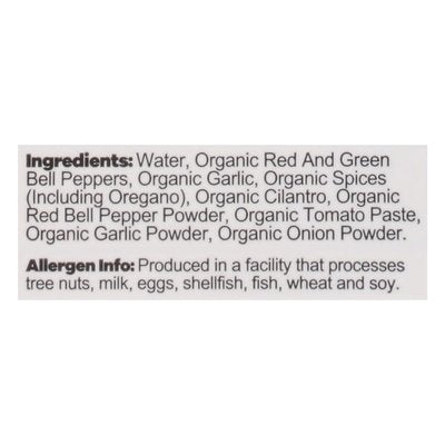 INGREDIENTS: Water, Organic Red and Green Bell Peppers, Organic Garlic, Organic Spices (Including Oregano), Organic Cilantro, Organic Red Bell Pepper Powder, Organic Tomato Paste, Organic Garlic Powder, Organic Onion Powder.