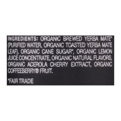 INGREDIENTS: Organic Brewed Yerba Mate (Fair Trade) (Purified Water, Organic Toasted Yerba Mate Leaf), Organic Cane Sugar (Fair Trade), Organic Lemon Juice Concentrate, Organic Natural Flavors, Organic Acerola Cherry Extract, Organic Coffeeberry Fruit.