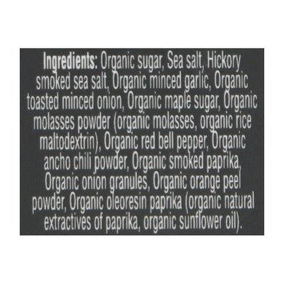 INGREDIENTS: Organic Sugar, Sea Salt, Hickory Smoked Sea Salt, Organic Minced Garlic, Organic Toasted Minced Onion, Organic Maple Sugar, Organic Molasses Powder (Organic Molasses, Organic Rice Maltodextrin), Organic Red Bell Pepper, Organic Ancho Chili Powder, Organic Smoked Paprika, Organic Onion Granules, Organic Orange Peel Powder, Organic Oleoresin Paprika (Organic Natural Extractives of Paprika, Organic Sunflower Oil).