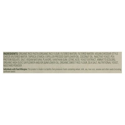 INGREDIENTS: Organic Rice Pasta (Organic Rice Flour, Filtered Water), Filtered Water, Vegan Cheddar-Style Cheeze (Filtered Water, Tapioca Starch, Expeller Pressed Safflower Oil, Coconut Oil, Inactive Yeast, Pea Protein Isolate, Salt, Vegan Natural Flavors, Xanthan Gum, Citric Acid, Yeast Extract, Annatto [Color]), Organic High Oleic Safflower and/or Sunflower Oil, Organic Sweet Rice Flour, Sea Salt, Nutritional Yeast, Mustard Powder.