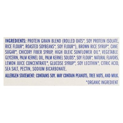 INGREDIENTS: Protein Grain Blend (Rolled Oats (Organic Ingredient), Soy Protein Isolate, Rice Flour (Organic Ingredient), Roasted Soybeans (Organic Ingredient), Soy Flour (Organic Ingredient)), Brown Rice Syrup (Organic Ingredient), Cane Sugar (Organic Ingredient), Chicory Fiber Syrup, High Oleic Sunflower Oil (Organic Ingredient), Vegetable Glycerin, Palm Kernel Oil, Palm Kernel Solids (Organic Ingredient), Soy Flour, Natural Flavors, Lemon Juice Concentrate (Organic Ingredient), Glucose Syrup (Organic Ingredient), Soy Lecithin (Organic Ingredient), Citric Acid, Sea Salt, Pectin, Sodium Bicarbonate.