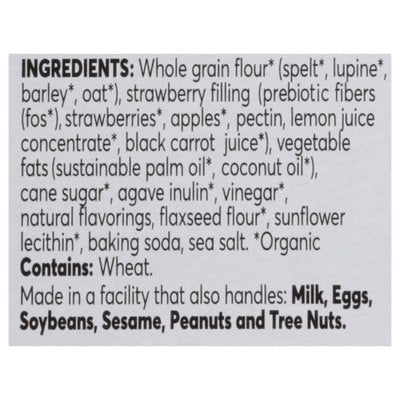 INGREDIENTS: Whole Grain Flour (Organic) (Spelt (Organic), Lupine (Organic), Barley (Organic), Oat (Organic)), Strawberry Filling (Prebiotic Fibers (Fos (Organic)), Strawberries (Organic), Apples (Organic), Pectin, Lemon Juice Concentrate (Organic), Black Carrot Juice (Organic), Vegetable Fats (Sustainable Palm Oil (Organic), Coconut Oil (Organic)), Cane Sugar (Organic), Agave Inulin (Organic), Vinegar (Organic), Natural Flavorings, Flaxseed Flour (Organic), Sunflower Lecithin (Organic), Baking Soda, Sea Salt.