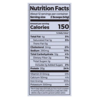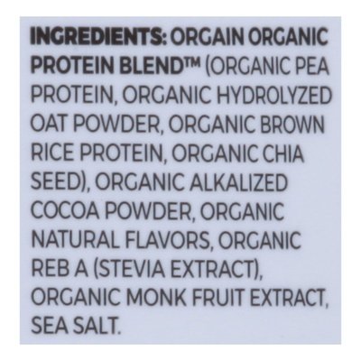 INGREDIENTS: Ograin Organic Protein Blend (Organic Pea Protein, Organic Hydrolyzed Oat Powder, Organic Brown Rice Protein, Organic Chia Seed), Organic Alkalized Cocoa Powder, Organic Natural Flavors, Organic Reb a (Stevia Extract), Organic Monk Fruit Extract, Sea Salt.