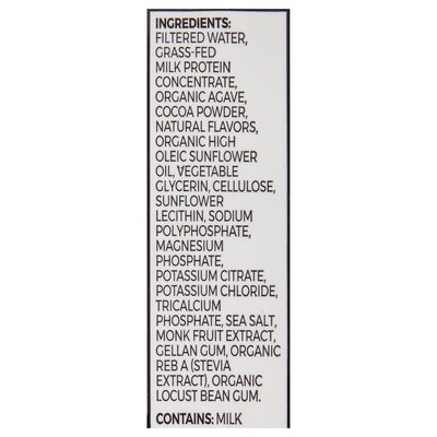 INGREDIENTS: Filtered Water, Grass Fed Milk Protein, Concentrate, Organic Agave, Cocoa Powder, Natural Flavors, Organic High Oleic Sunflower, Oil, Vegetable Glycerin, Cellulose, Sunflower Lecithin, Sodium Polyphosphate, Magnesium Phosphate, Potassium Citrate, Potassium Chloride, Tricalcium Phosphate, Sea Salt, Monk Fruit Extract, Gellan Gum, Organic Reb a (Stevia Extract), Organic Locust Bean Gum.