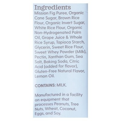 INGREDIENTS: Mission Fig Puree, Organic Cane Sugar, Brown Rice Flour, Organic Invert Sugar, White Rice Flour, Organic Non-Hydrogenated Palm Oil, Grape Juice & Whole Rice Syrup, Tapioca Starch, Glycerin, Sweet Rice Flour, Sweet Whey Powder (Milk), Pectin, Xanthan Gum, Sea Salt, Baking Soda, Citric Acid (Added for Flavor), Gluten-Free Natural Flavor, Lemon Oil.