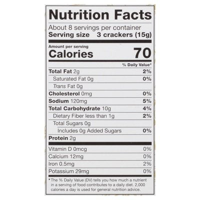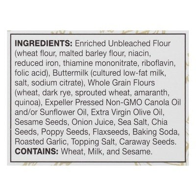 INGREDIENTS: Enriched Unbleached Flour (Wheat Flour, Malted Barley Flour, Niacin, Reduced Iron, Thiamine Mononitrate, Riboflavin, Folic Acid), Buttermilk (Cultured Low-Fat Milk, Salt, Sodium Citrate), Whole Grain Flours (Wheat, Dark Rye, Sprouted Wheat, Amaranth, Quinoa), Expeller Pressed Non-GMO Canola Oil and/or Sunflower Oil, Extra Virgin Olive Oil, Sesame Seeds, Onion Juice, Sea Salt, Chia Seeds, Poppy Seeds, Flaxseeds, Baking Soda, Roasted Garlic, Topping Salt, Caraway Seeds.