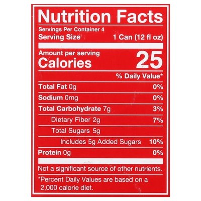INGREDIENTS: Sparkling Water, Organic Cane Sugar, Organic Apple Cider Vinegar, Cherry Juice (Concentrate), Organic Agave Inulin, Natural Flavors, Lemon Juice (Concentrate), Lime Juice (Concentrate), Stevia.