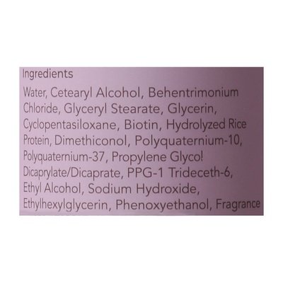 INGREDIENTS: Water, Cetearyl Alcohol, Behentrimonium Chloride, Glyceryl Stearate, Glycerin, Cyclopentasiloxane, Biotin, Hydrolyzed Rice Protein, Dimethiconol, Polyquaternium-10, Polyquaternium-37, Propylene Glycol Dicaprylate/Dicaprate, PPG-1 Trideceth-6, Ethyl Alcohol, Sodium Hydroxide, Ethylhexylglycerin, Phenoxyethanol, Fragrance.
