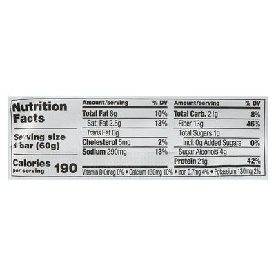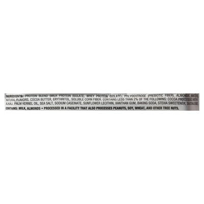 INGREDIENTS: Protein Blend (Milk Protein Isolate, Whey Protein Isolate), Polydextrose (Prebiotic Fiber), Almonds, Water, Natural Flavors, Cocoa Butter, Erythritol, Soluble Corn Fiber, Contains Less than 2% of the Following: Cocoa Processed with Alkali, Palm Kernel Oil, Sea Salt, Sodium Caseinate, Sunflower Lecithin, Xanthan Gum, Baking Soda, Stevia Sweetener, Sucralose.