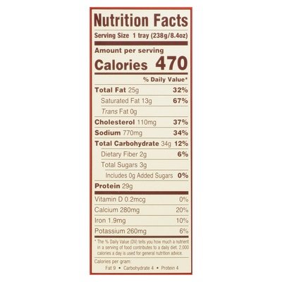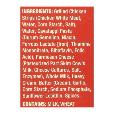 INGREDIENTS: Grilled Chicken Strips (Chicken White Meat, Water, Corn Starch, Salt), Water, Cavatappi Pasta (Durum Semolina), Parmesan Cheese (Pasteurized Part-Skim Cow's Milk, Cheese Cultures, Salt and Enzymes), Whole Milk, Heavy Cream, Butter (Sweet Cream), Garlic, Food Starch, Disodium Phosphate, Sunflower Lecithin, Spices.