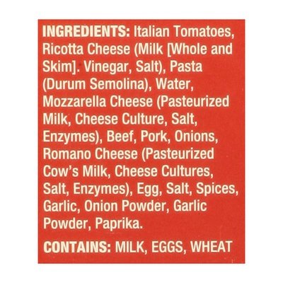 INGREDIENTS: Italian Tomatoes (Italian Tomatoes, Tomato Puree), Ricotta Cheese (Milk [Whole and Skim], Vinegar, Salt), Pasta (Durum Semolina), Water, Mozzarella Cheese (Pasteurized Milk, Cheese Cultures, Salt, Enzymes), Beef, Pork, Onion, Romano Cheese (Pasteurized Cow's Milk, Cultures, Salt, Enzymes), Whole Egg, Salt, Spices, Garlic, Onion Powder, Garlic Powder, Paprika.