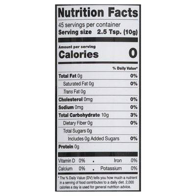 PRODUCT DETAILS: 0 calories; net carbs; glycemic. Zero net carbs. Net Carbs Calculation: Total Carbs/Serving 10 g; Less: Allulose Carbs (10 g). Total Net Carbs 0 g. This product is Keto certified. ketocertified.com. Gluten free. Vegan. Non-GMO Project verified. nongmoproject.org. Sugar reimagined. Delicious. Plant-based certified. Blood sugar friendly. Allulose Sugar is a plant-based rare sugar and per the FDA is different from other sugars in that it is not metabolized by the human body in the same way as table sugar(sucrose). It produces only negligible increases in blood glucose or insulin levels and does not promote dental decay. RxSugar. There is no substitute. Perfect for: Coffee and tea; Protein shakes; Cereal and yogurt; Fruit bowls; Sweet treats. Ideal for Baking & Cooking: 1.25 cup RxSugar = 1 cup sugar. Tastes great and dissolves easily. Caramelizes, browns and binds. The best sugar for keto recipes. Suitable for people with diabetes. RxSugar is sugar reimagined. www.RxSugar.com. Be Rxtraordinaty! Follow & tag us! (at)rxsugar (hashtag)sugarreimagined.