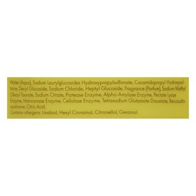INGREDIENTS: Water (Aqua), Sodium Laurylglucosides Hydroxypropylsulfonate, Cocamidopropyl Hydroxysultaine, Decyl Glucoside, Sodium Chloride, Heptyl Glucoside, Fragrance (Parfum), Sodium Methyl Oleoy/Taurate, Sodium Citrate, Protease Enzyme, Alpha-Amylase Enzyme, Pectate Lyase Enzyme, Mannanase Enzyme, Cellulase Enzyme, Tetrasodium Glutamate Diacetate, Benzisathiazolinone, Citric Acid.