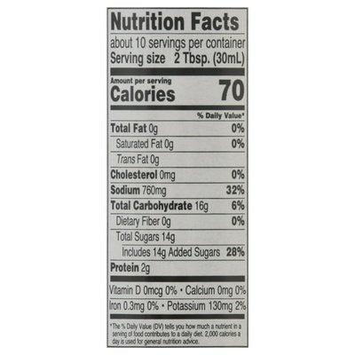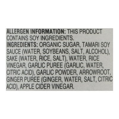 INGREDIENTS: Organic Sugar, Tamari Soy Sauce (Water, Soybeans, Salt, Alcohol), Sake (Water, Rice, Salt), Water, Rice Vinegar, Garlic Puree (Garlic, Water, Citric Acid), Garlic Powder, Arrowroot, Ginger Puree (Ginger, Water, Salt, Citric Acid), Apple Cider Vinegar.